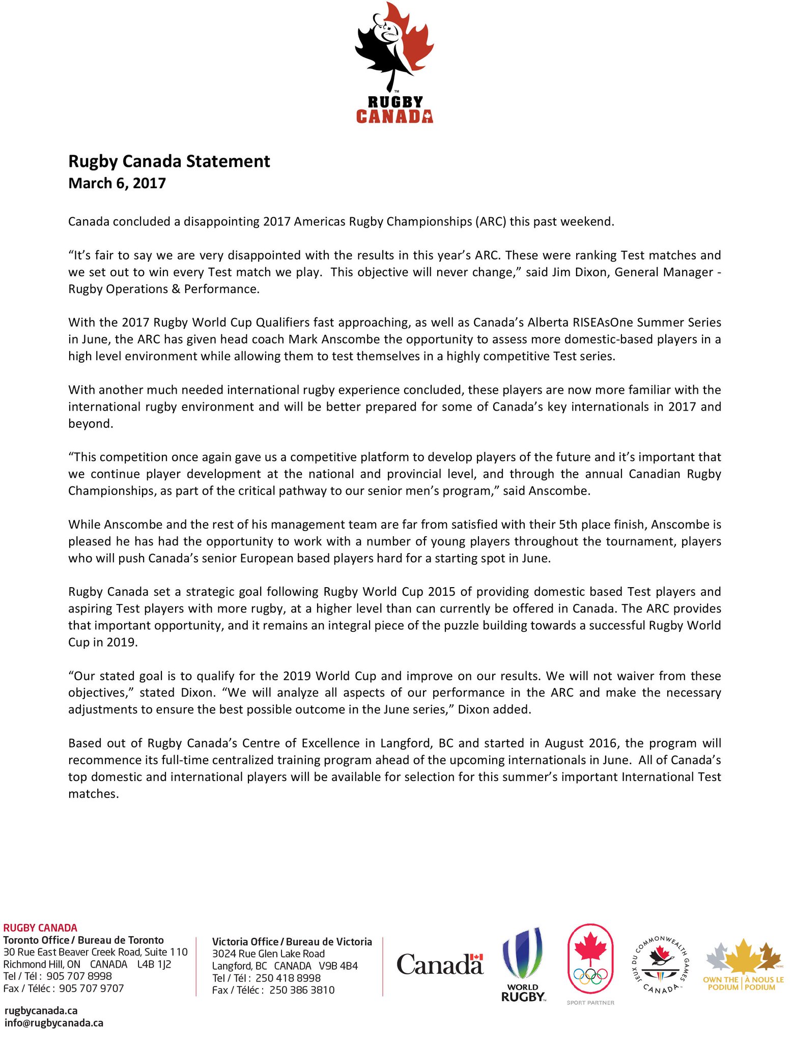 LANGFORD, BC – After a very disappointing Americas Rugby Championship performance, Rugby Canada reflected that sentiment on social media. A stunning loss to Chile was a lot for Canadian fans to accept and questions were being asked. To their credit, team management didn’t run for shelter. Instead, GM Jim Dixon went public on Twitter and Facebook. Here’ is the Twitter post, followed by the enlarged jpg version of his Official Rugby Canada Statement: